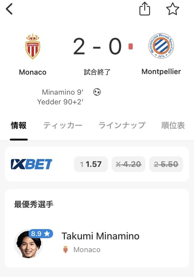 後半アディショナルタイム2分にベン・ヤーデルのゴールで1点を加えたモナコが2-0で勝利。フル出場で躍動したサムライ戦士の一撃が決勝点となった。