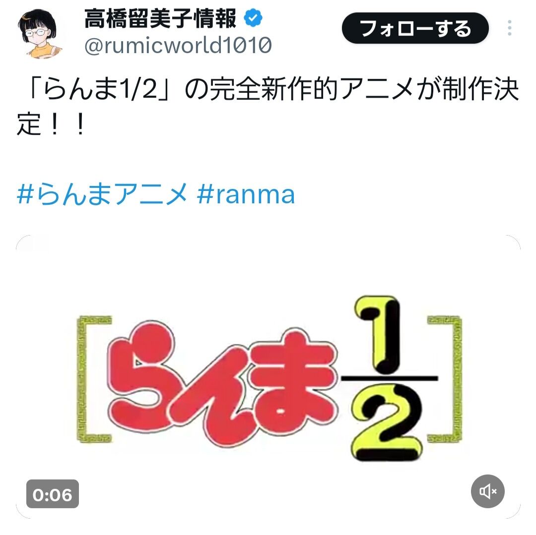 さらにアニメ『らんま1/2』の公式Xも開設され、「『らんま1/2」完全新作的アニメ制作決定! 高橋留美子先生による格闘ラブコメディーの名作を新作アニメ化します」と発表。