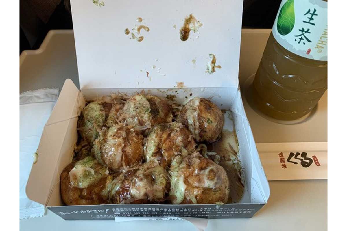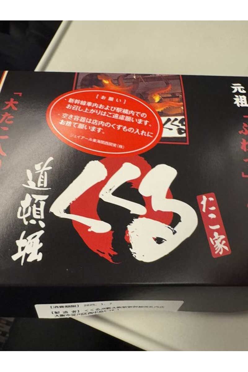 話題となっているたこ焼きは、JR新大阪駅の新幹線改札内のフードコート「大阪のれんめぐり」に出店している「たこ家道頓堀くくる」JR新大阪駅店。新幹線の改札内で販売されている商品にもかかわらず、パッケージ容器には「新幹線車内および駅構内でのお召し上がりはご遠慮願います」という注意書きのシールが貼られている。