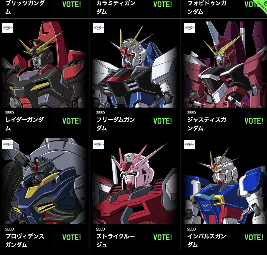 投票の対象となるのは同ウェブサイトに収録済みの「宇宙世紀シリーズ」および「オルタナティブシリーズ」に分類されるアニメーション作品(一部を除く)のなかから、独自の基準で選ばれた「ガンダム」です。
