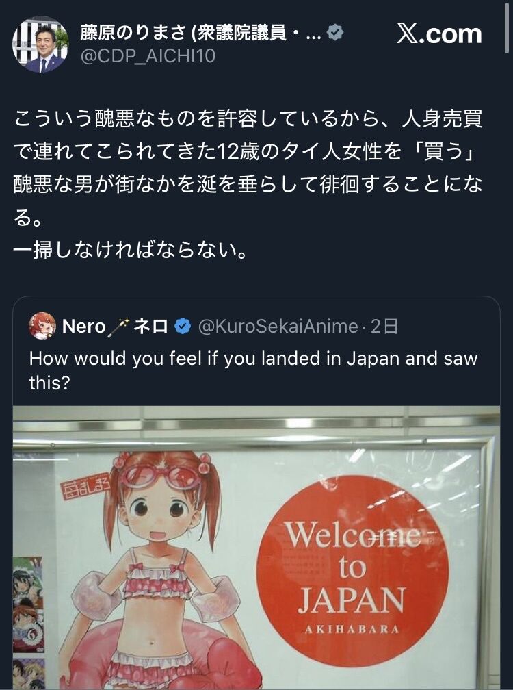 藤原氏は、人気漫画「苺ましまろ」のキャラクターの少女が、ビキニ姿で浮輪を持つデザインで、秋葉原への訪日客を歓迎するメッセージの入ったDVDパッケージの投稿を引用。「こういう醜悪なものを許容しているから、人身売買で連れてこられてきた12歳のタイ人女性を『買う』醜悪な男が街なかを涎を垂らして徘徊することになる。一掃しなければならない」と私見を示した。